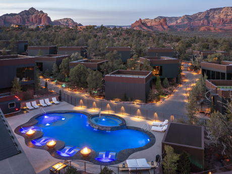 Located at 900 W. State Route 89A, Ambiente features 40 glass guest atriums on a 3-acre site. The accommodations feature floor-to-ceiling windows, private rooftop decks with fireplaces and curated interior finishes. Onsite amenities include Forty1 restaurant, Velvet Spa and 600 square feet of event space. The landscape hotel is one of Arizona’s only two Michelin Key hotels.