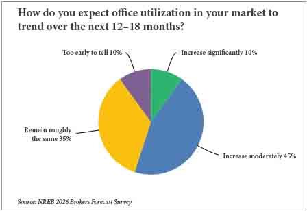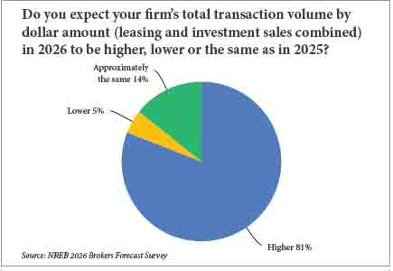 For example, among brokers, 81 percent of respondents believed that their firms’ total transaction volume by dollar amount, inclusive of both leasing and investment sales, would be higher in 2026 than 2025 (see chart below).