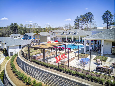 Delivered in 2018, the community offers three-bedroom units with front and back porches. Shared amenities include a resort-style pool and hot tub, sun deck, poolside lounge, Jumbotron, sand volleyball court, fitness center, recreation center, grilling stations, fire pits, two dog parks, group and private study lounges and a computer lab.